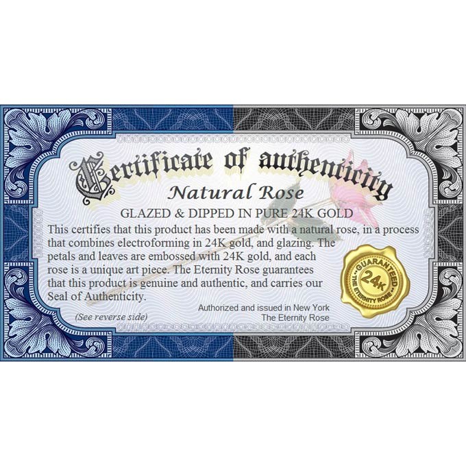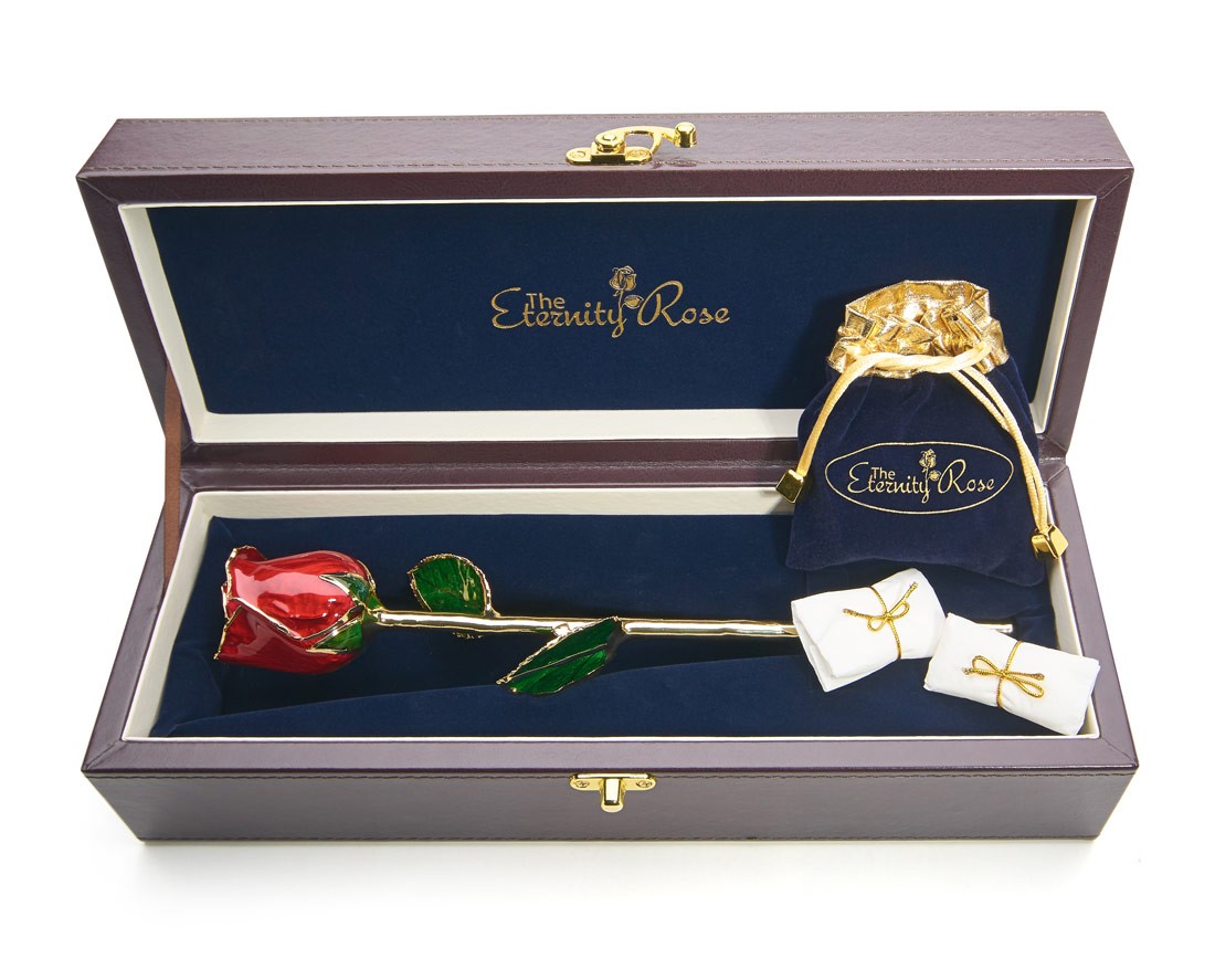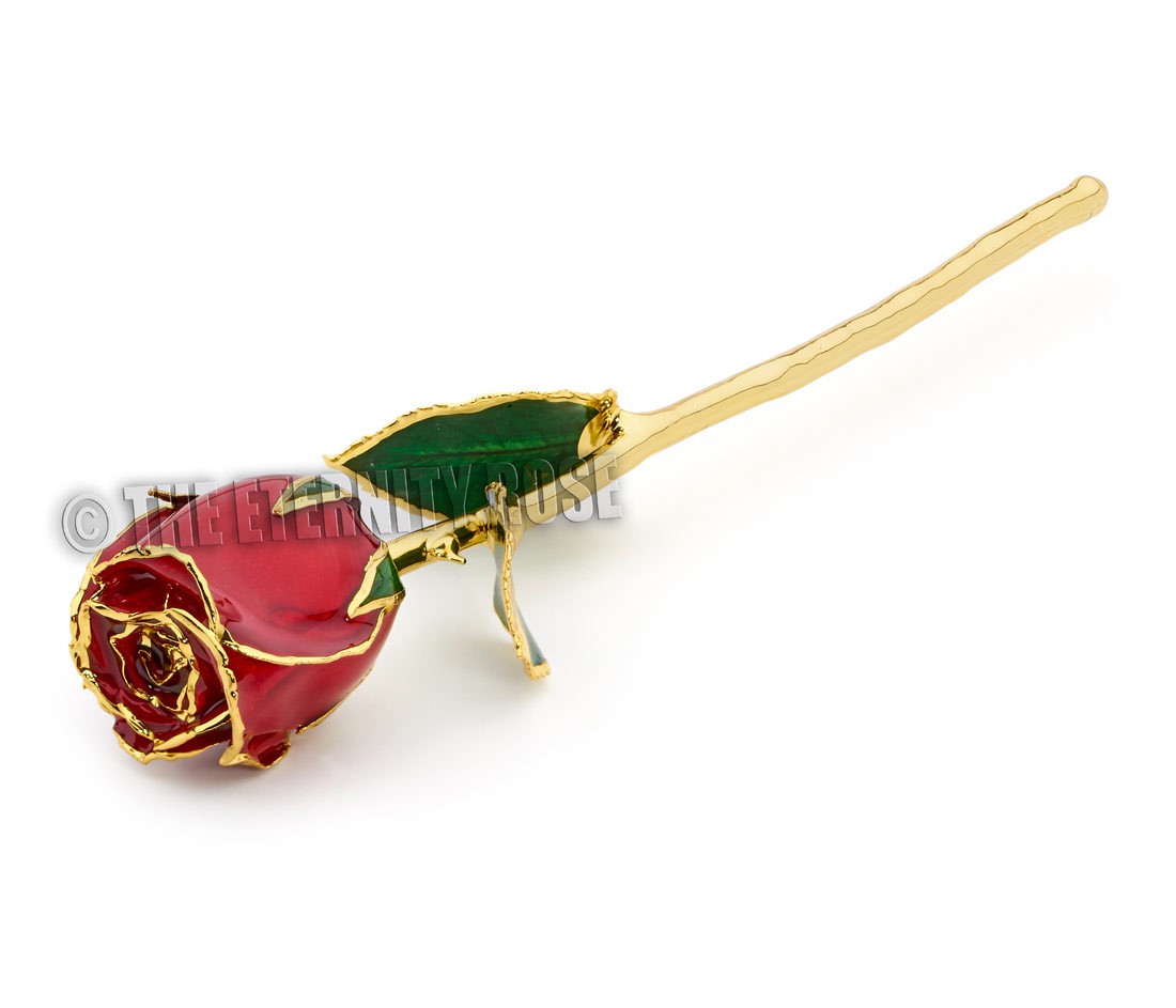 - A perfectly preserved and glazed natural red rose featuring pure 24 karat gold trimming. The leaves are 24 karat gold and glazed lattice, and the rose head and stem total around 12" in length.