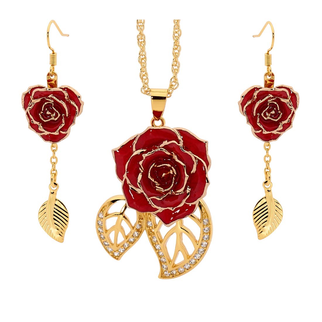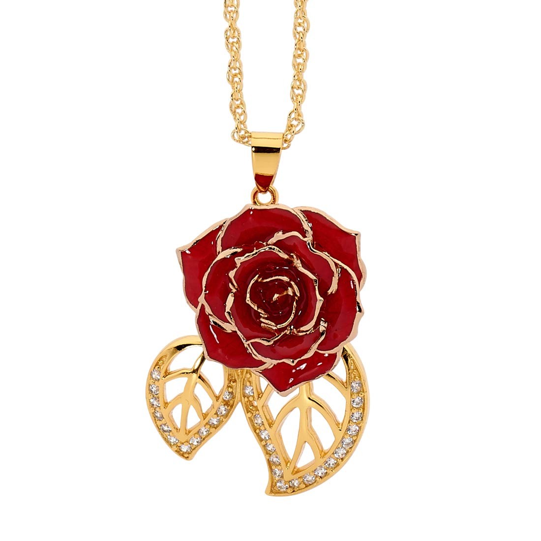 - A stylish pendant formed from real natural red rose petals that have been glazed and decorated with a trim of pure 24 karat gold. Featuring a 3/4" diameter miniature rose head, the pendant is 1 1/2" high overall and has a width of 1.1". The rose pendant is complemented by two leaf figurines, encrusted with 30 synthetic diamonds and dipped in 24 karat gold.